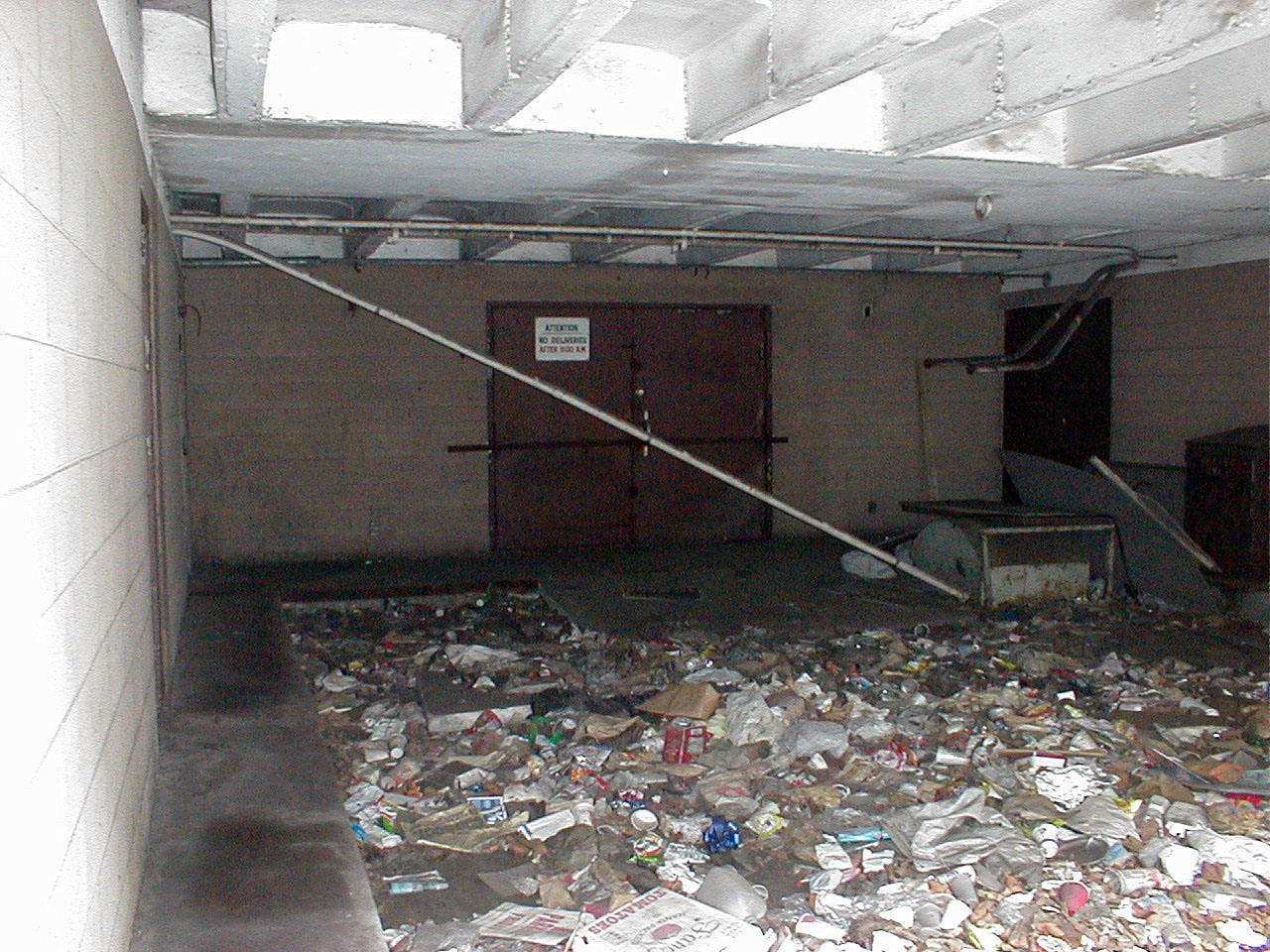 The trash-strewn loading dock. Not even vagrants will take refuge here.