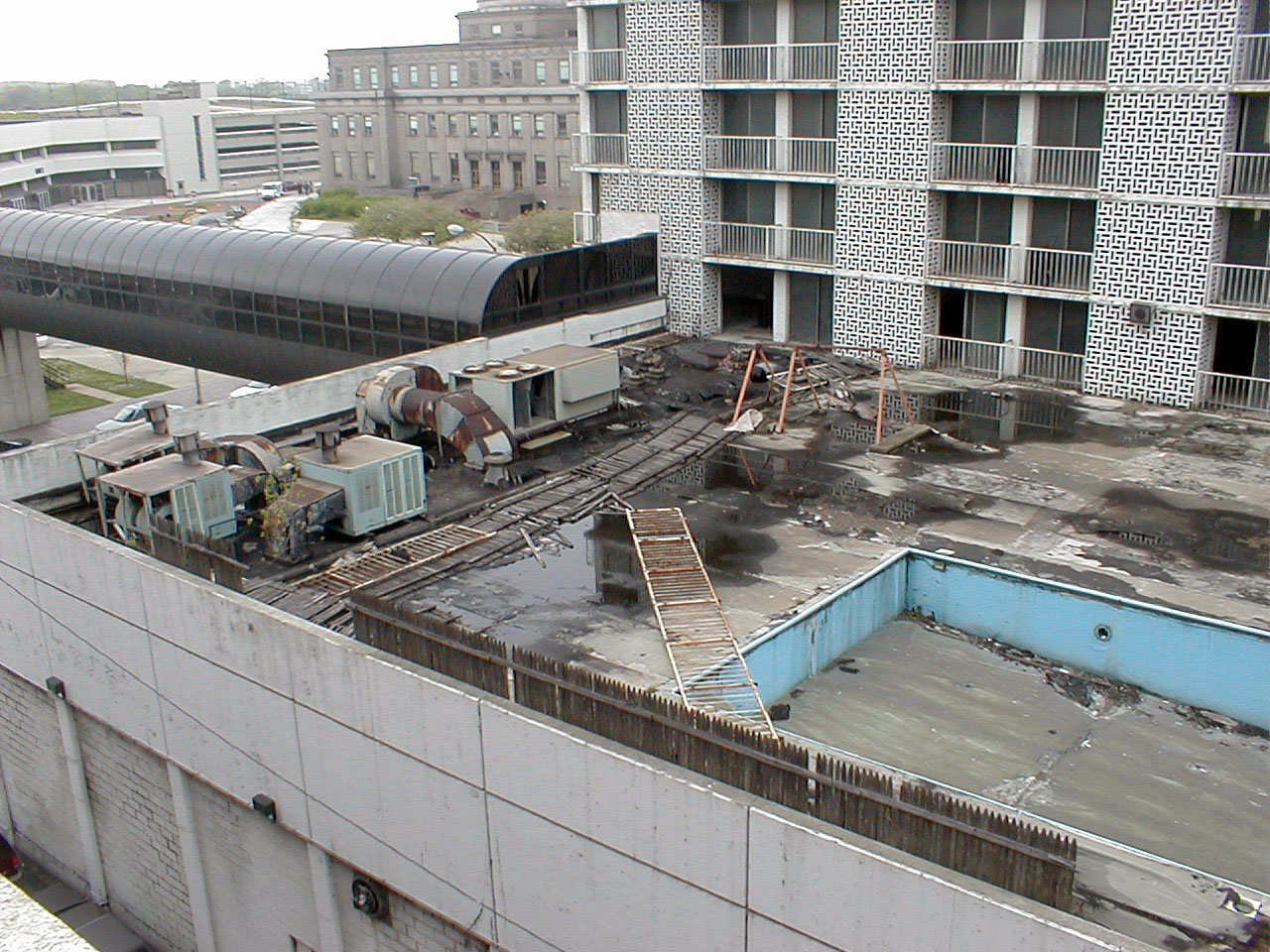 The rooftop swimming pool, with only a broken swing set and railing left.