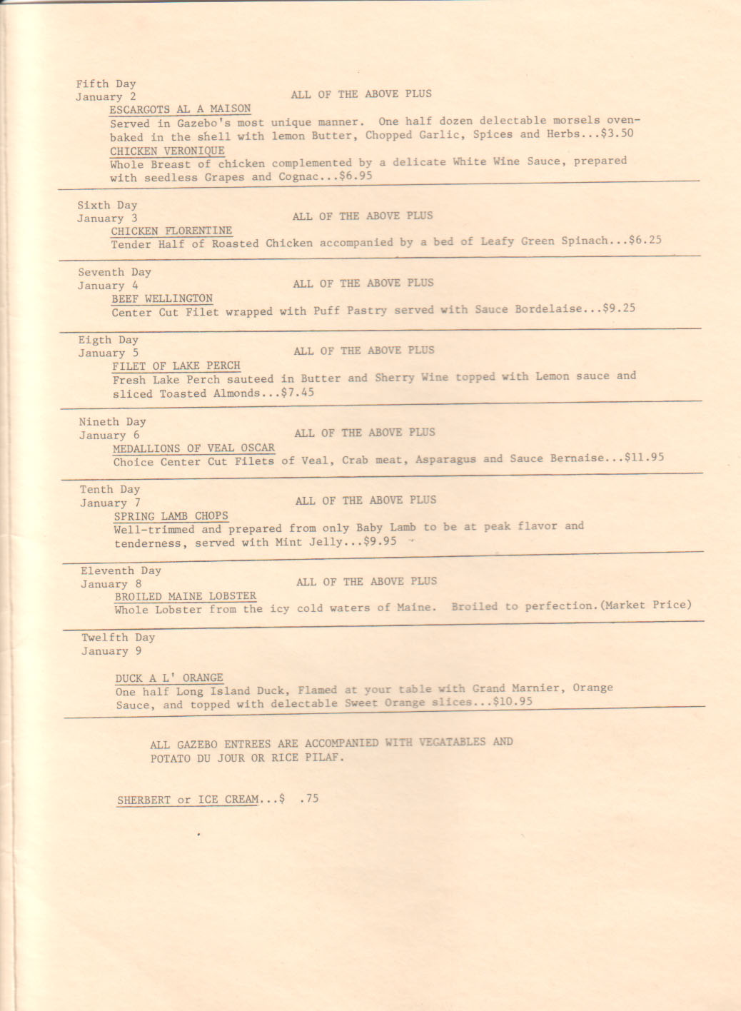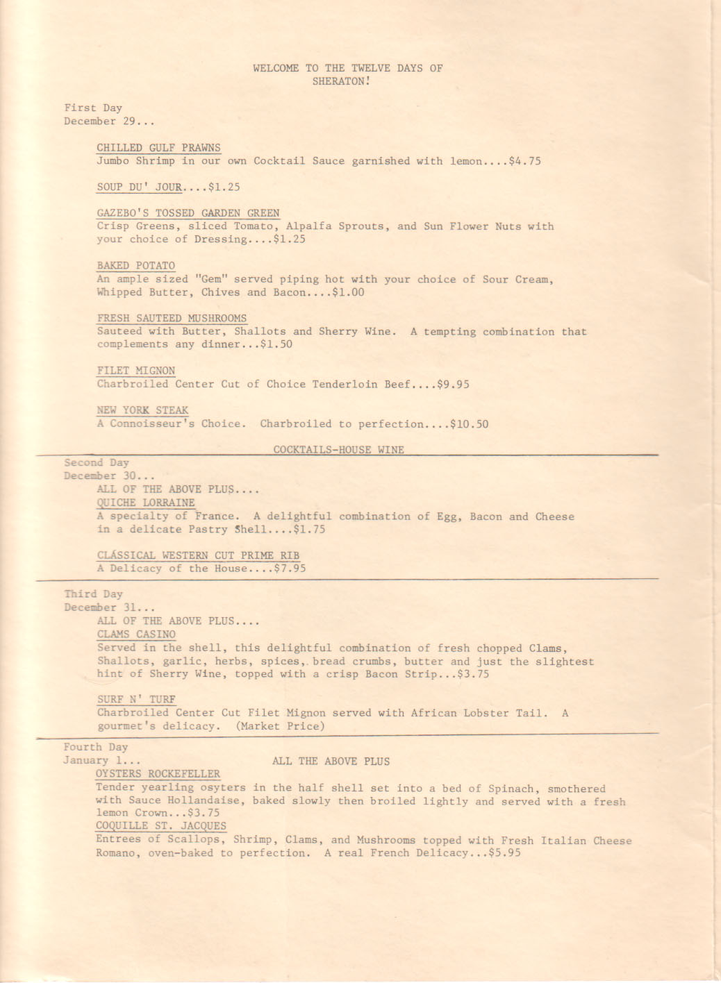 By all accounts there was much excitement about the opening. A live act called “The Independent Movement” was the first entertainment in the “Visions Lounge”, which had the typical “mirrors everywhere” decor of the era. The hotel hosted the “Twelve Days of Sheraton” during which the Gazebo Restaurant added a new entrée each day to the menu.