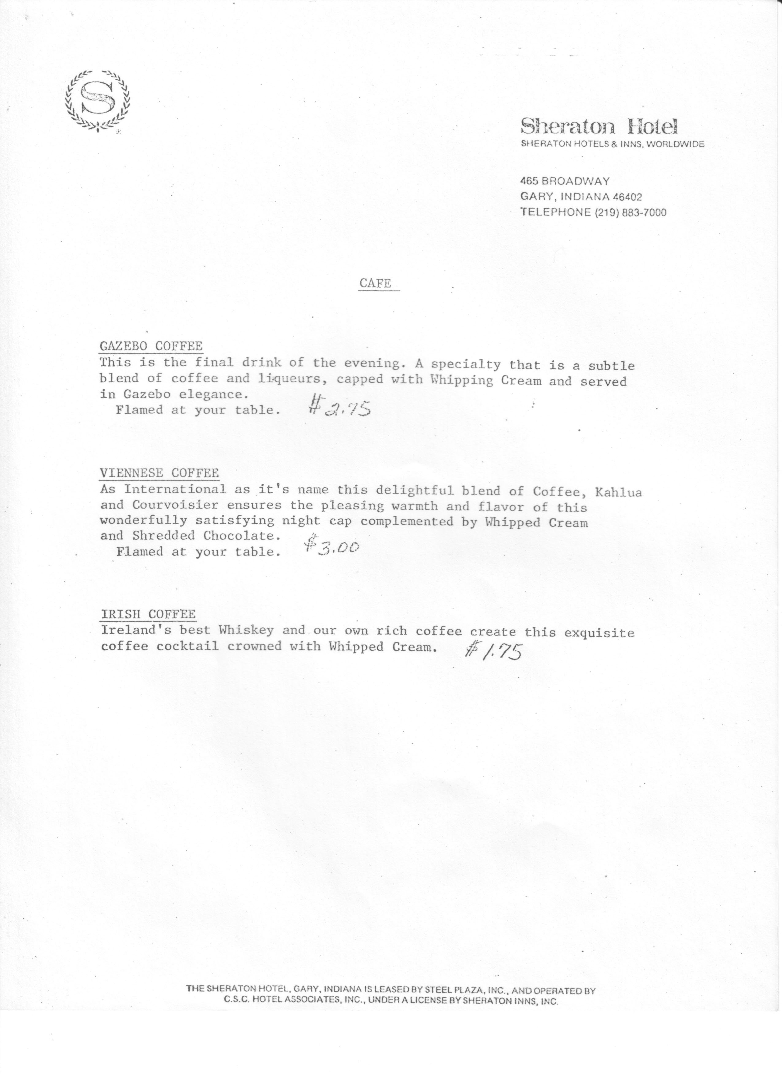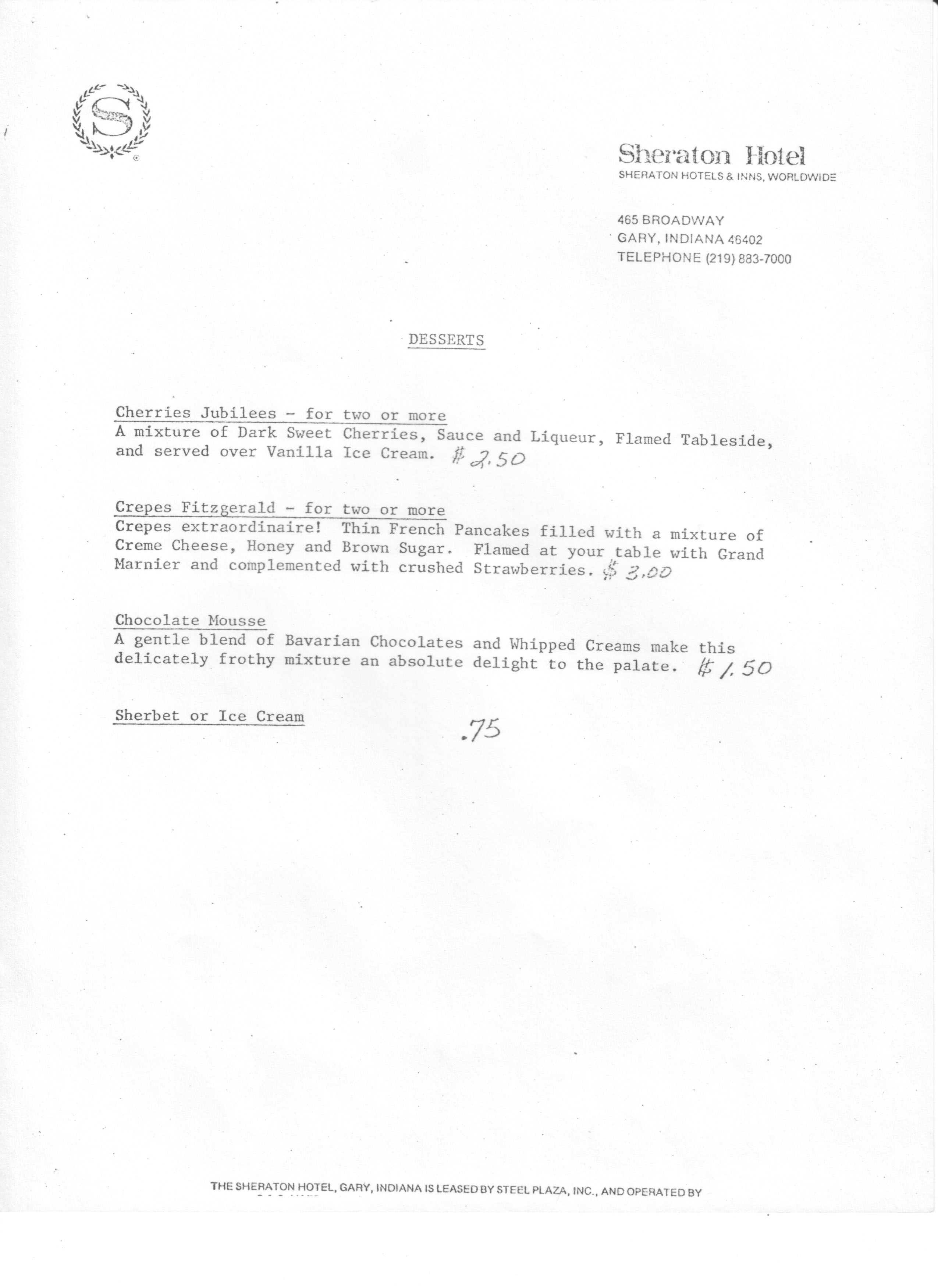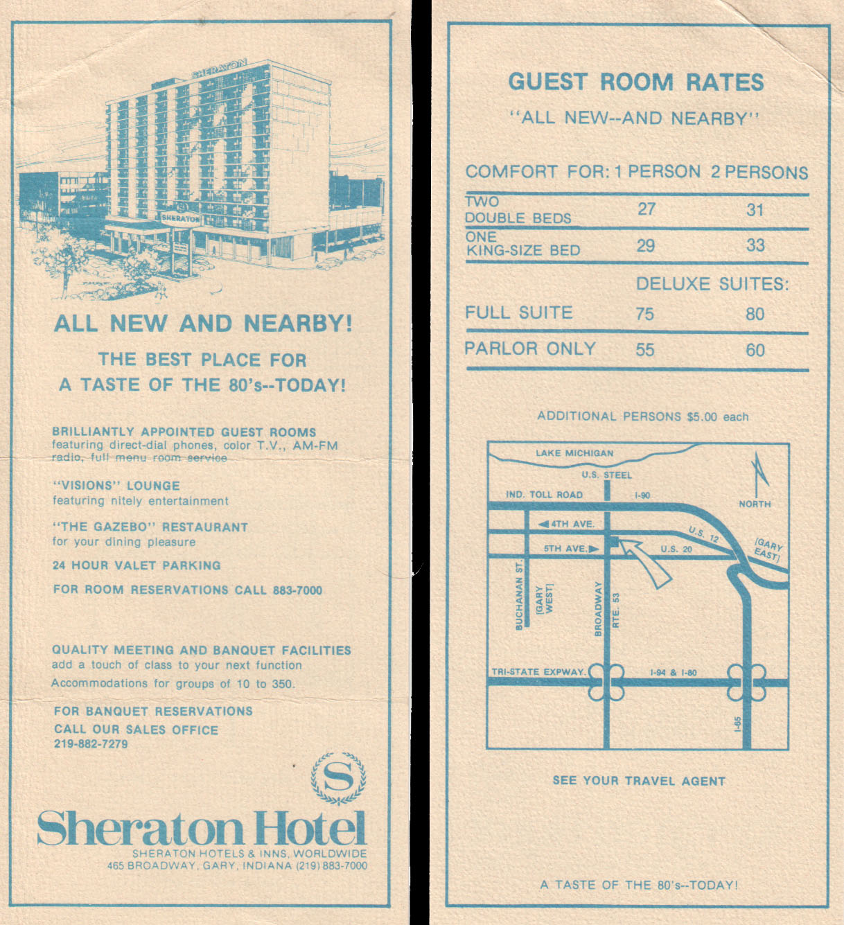 The original brochure for the Sheraton Gary. Single occupancy double bed rooms were only $27 in 1978 – still unaffordable for many local residents. [Click for a larger picture]