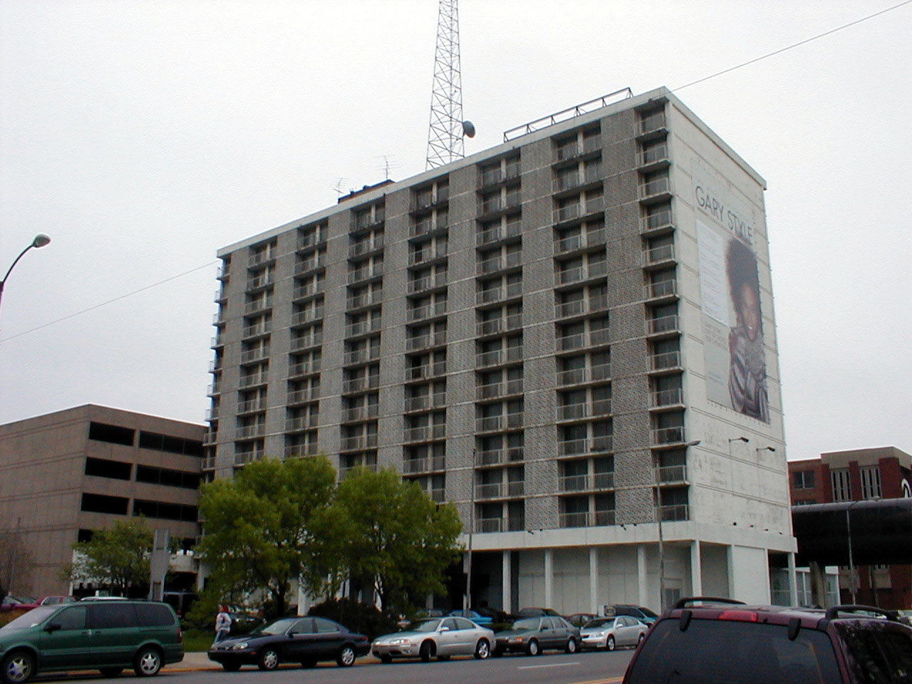 The Sheraton Gary today. The building now serves as a platform for a communication tower perched on its roof.