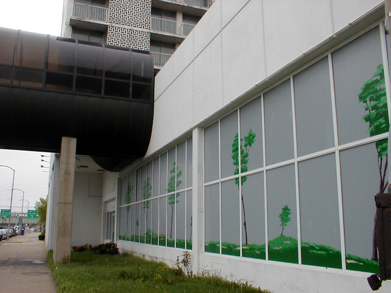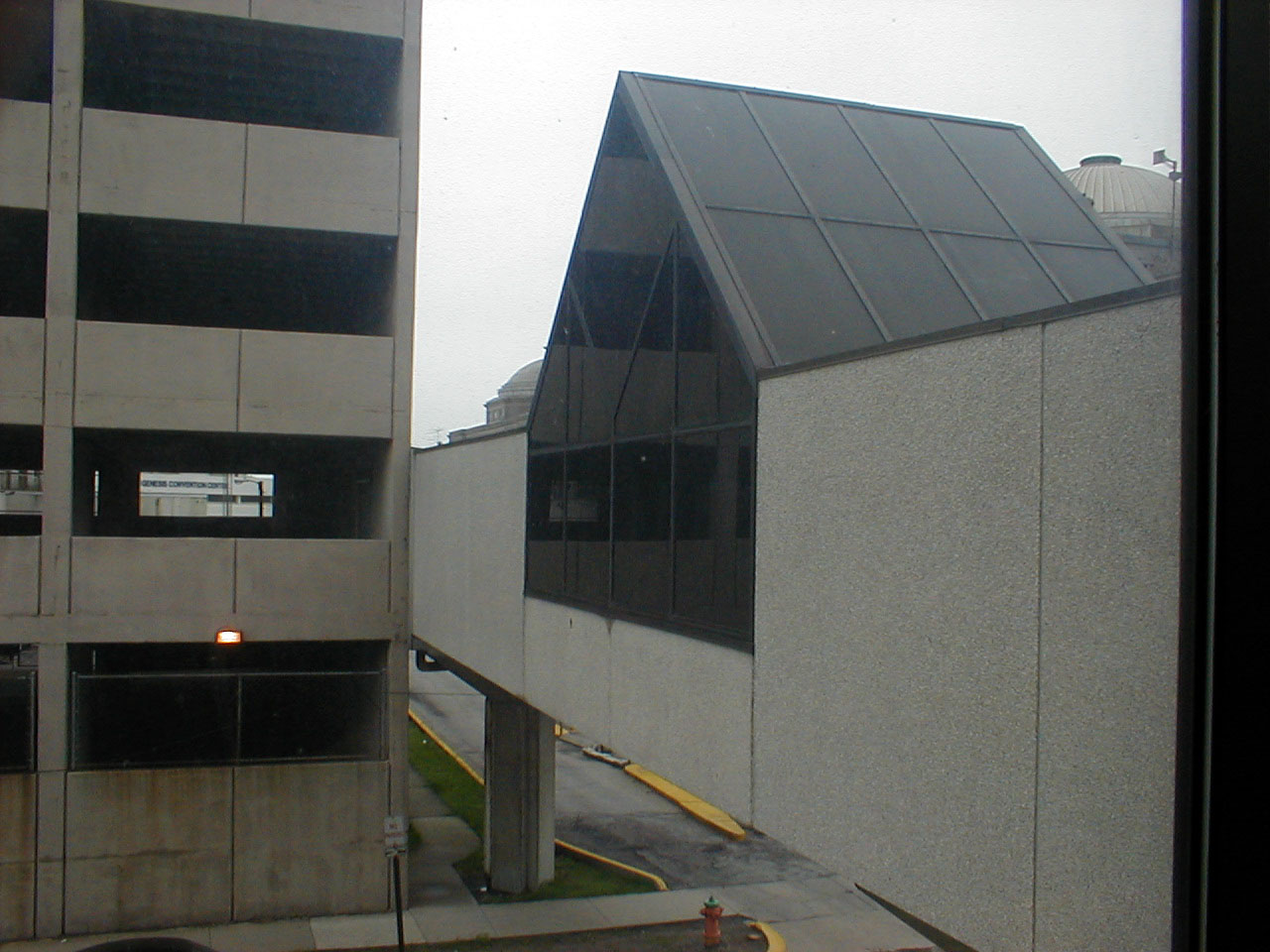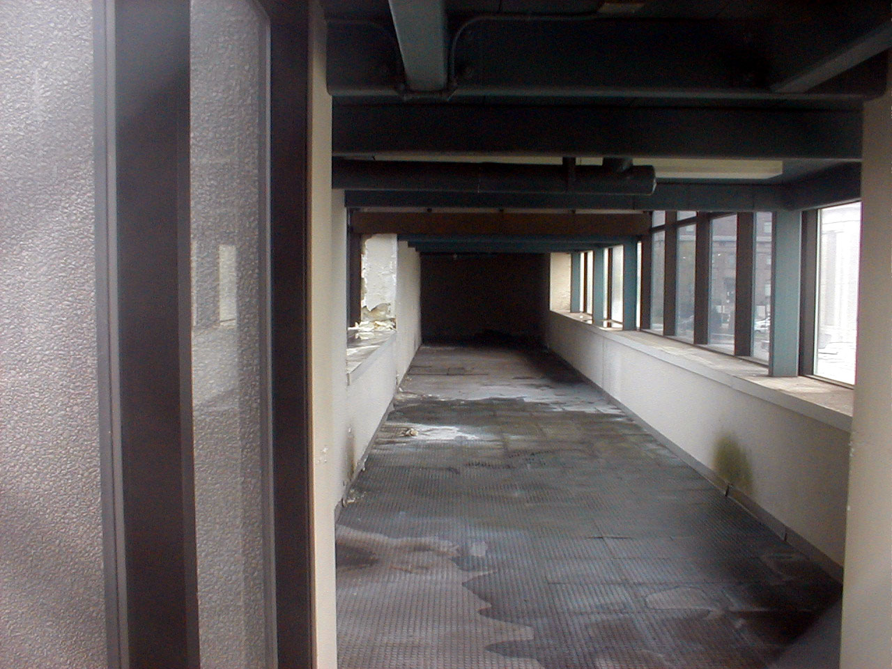 The parking garage attached to the hotel is also closed – though it might benefit the city to reopen it as the lot in front of city hall is too small and cars routinely use the front driveway of the hotel as extra parking. On either end of the hotel are skywalks – a locked one that connects to the Sports Complex next door, and a tube over Broadway that connects to nothing but a staircase as the Convention Center is smaller than intended.  Boards cover windows, painted to look like windows.