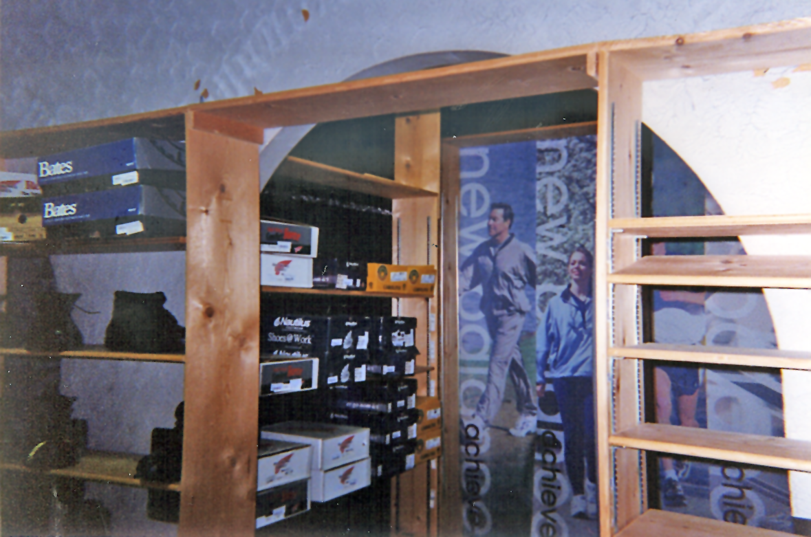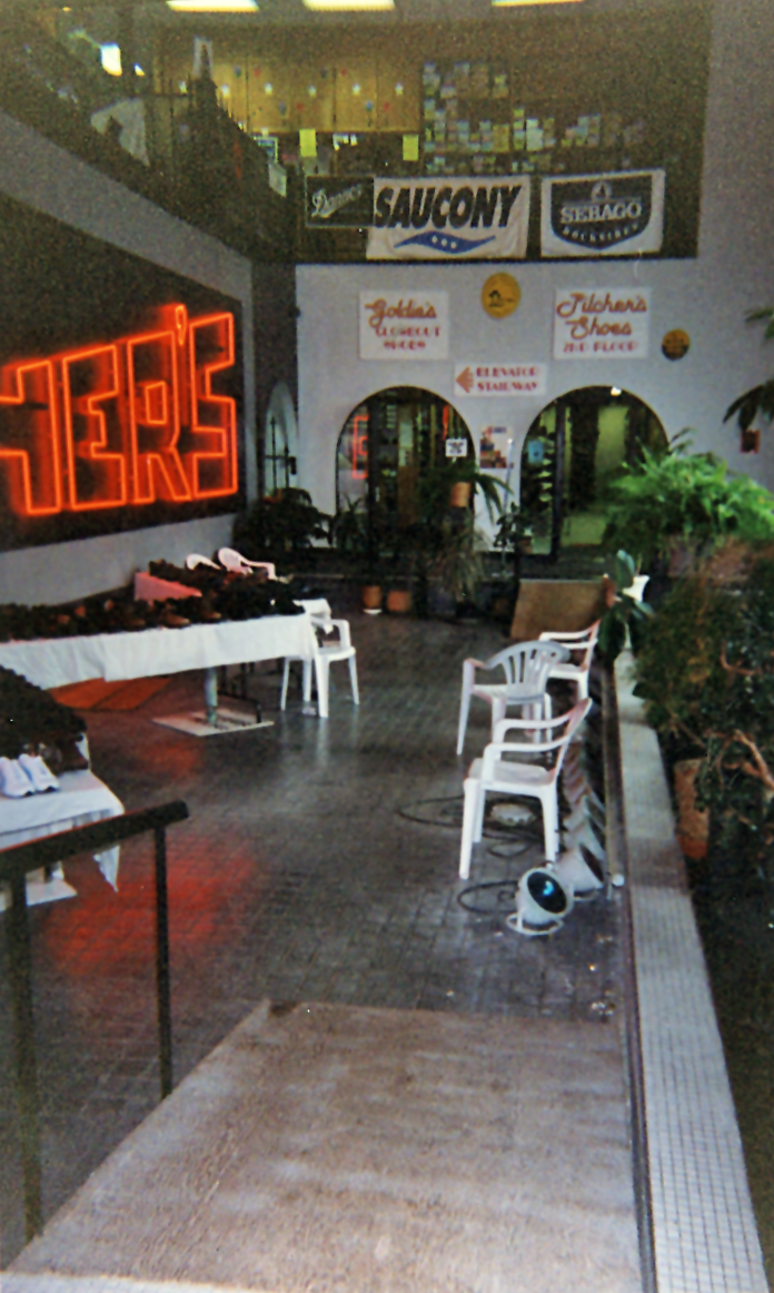 Wooden shelves filled with boots now line the walls where the statues, paintings and checkerboard once stood. Sale tables line the front of the building, where newly constructed steps and strategically placed potted plants help you forget you are stepping into what once was a fountain. A gigantic “Pilchers” neon sign now glows in the night through the windows.